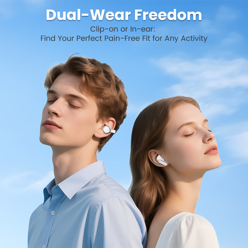 DUBBLA STILAR I ETT FODRAL: Få det bästa av två världar med både in-ear-hörlurar och öronklämma-design. Välj den perfekta passformen för alla aktiviteter, oavsett om du behöver säker isolering för träning eller öppen komfort för avslappnad lyssning.